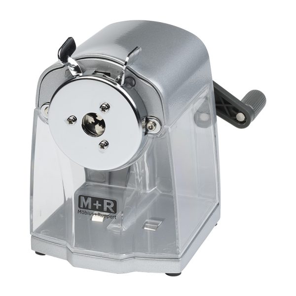 Kurbel-Spitzmaschine für Blei- und Farbstifte mit einem Durchmesser von bis zu 11,2 mm, Qualitäts-Fräser, hochwertiges, massives Druckgussgehäuse, lange Spitze für Bleistifte, kurze Spitze für Farbstifte, wählbar mittels Rändelschraube, großer Spanbehälter, Tisch-Befestigung;